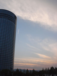 夕暮れ、超キレイ〜。しかし見てほしいのはホテル横の飛行機雲。